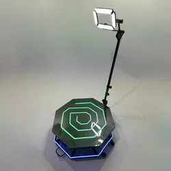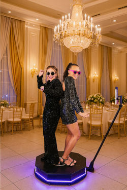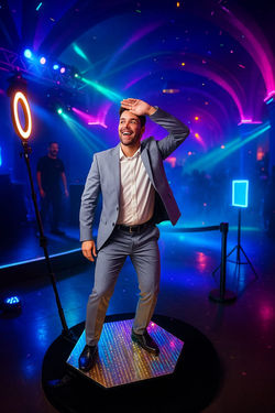 Os convidados sobem na plataforma e são filmados em alta qualidade enquanto o braço gira em 360°, criando vídeos dinâmicos com efeitos modernos e prontos para viralizar.
